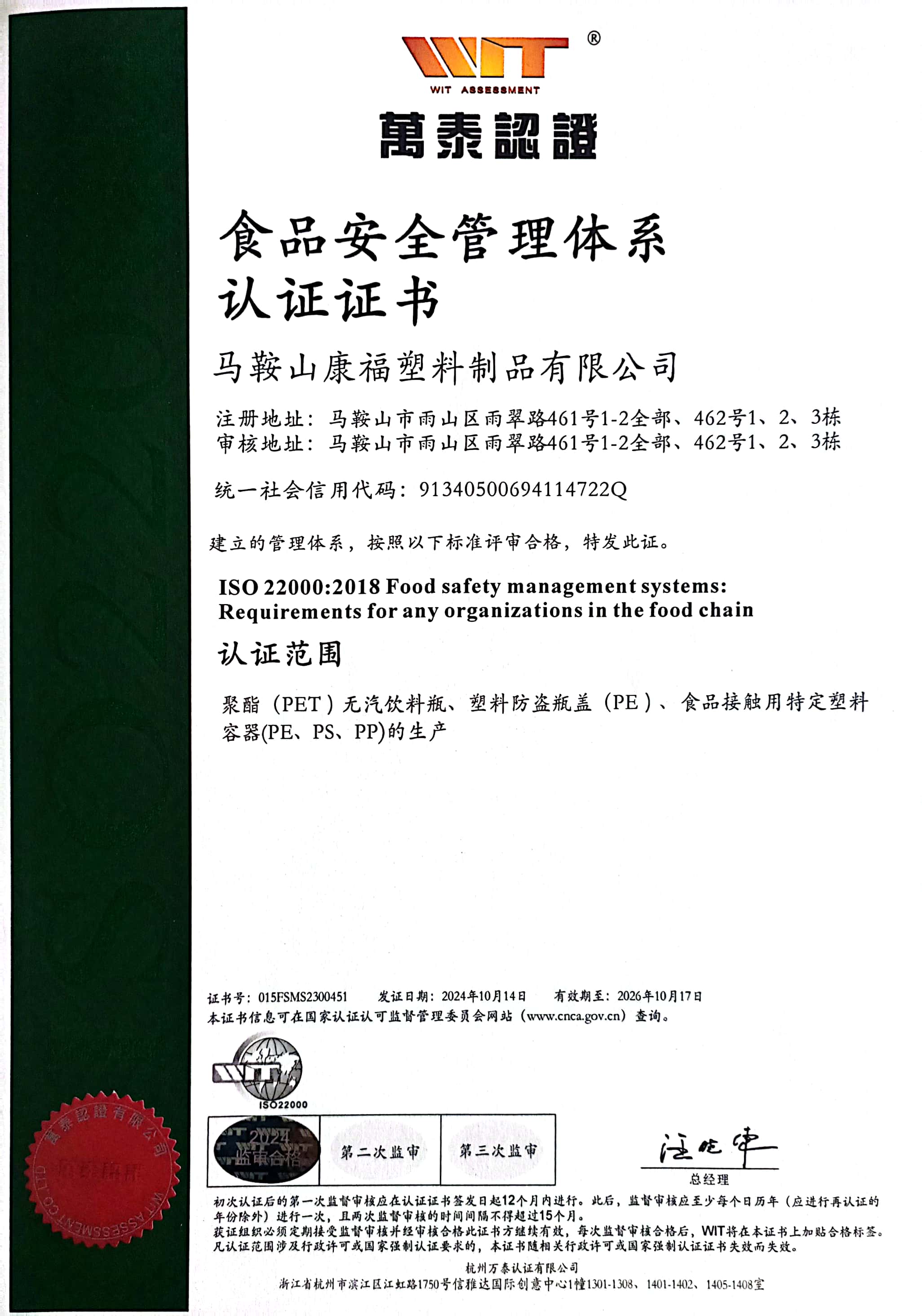 食品安全管理體系認證證書